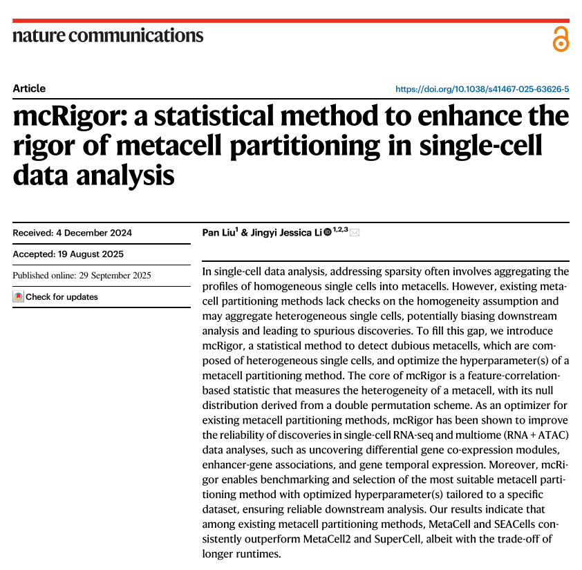 Pan Liu developed mcRigor, a statistical method that enhances the rigor of metacell partitioning in single-cell data analysis. mcRigor identifies heterogeneous metacells and optimizes hyperparameters of metacell partitioning methods to ensure reliable downstream analysis. The work was published in Nature Communications. Congratulations!